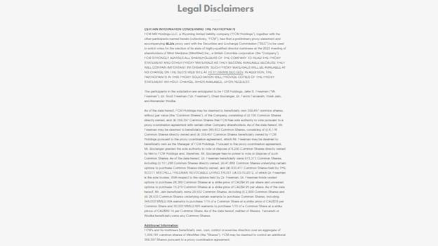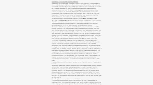 Shareholders are not being asked at this time to execute a proxy in favour of FCM's nominees for election to the Board at the AGM or any other resolutions at the AGM, which has not been formally scheduled. In connection with the AGM, FCM has filed preliminary proxy materials with the Securities and Exchange Commission and expects to issue a supplement thereto or amendment and restatement thereof (the "Final FCM Circular") containing further disclosure concerning FCM's nominees for election to the Board at the AGM, together with additional details concerning the completion and return of forms of proxy and voting information forms ("VIFs") for use at the AGM. Shareholders of MindMed are urged to read the Materials filed today as well as the Final FCM Circular, when issued, because they will contain important information.