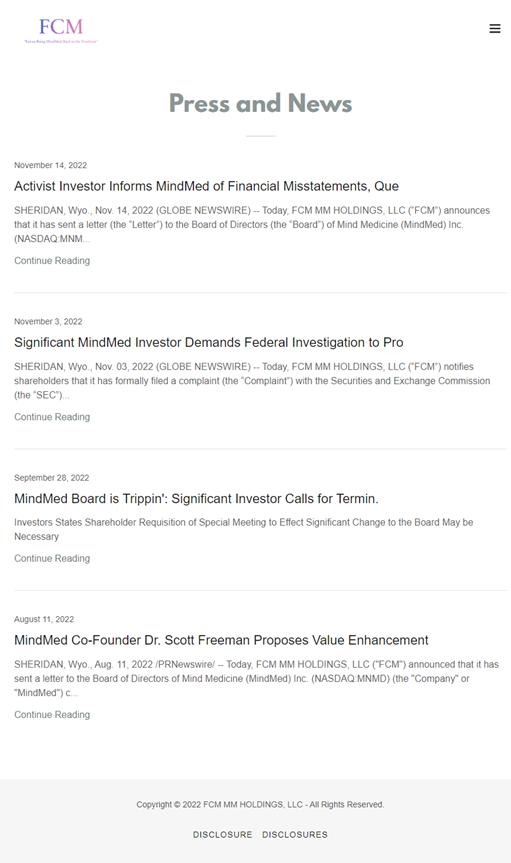 FCM MM Holdings, LLC, a Wyoming limited liablity company (“FCM Holdings”), together with the other participants named herein (collectively, “FCM”), has filed a preliminary proxy statement and accompanying BLUE proxy card with the Securities and Exchange Commission (“SEC”) to be used to solicit votes for the election of its slate of highly-qualified director nominees at the 2023 annual general meeting of shareholders of Mind Medicine (MindMed) Inc., a British Columbia corporation (the “Company”).