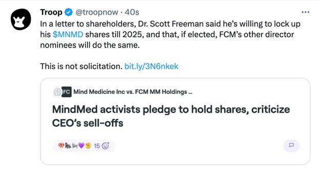 Dr. Freeman emphasizes his belief that for MindMed to be able to fully participate in the coming psychedelic medicine revolution it must have a healthy balance sheet. FCM believes that by cutting costs and doubling-down MindMed’s investment in its flagship drug LSD (MM-120) this is achievable. FCM’s director candidates will work to place MindMed as the market leader in psychedelic medicine in 2024, ahead of the other competitor companies like Compass, ATAI, and GH Research. FCM’s director candidates have the expertise, experience, and leadership skills to take advantage of this tidal wave of change and help ensure MindMed is positioned for future success in the years to come.