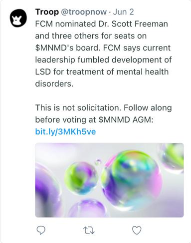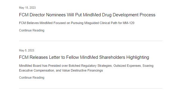 SHERIDAN, Wyo., June 2, 2023 (GLOBE NEWSWIRE) -- FCM MM Holdings, LLC (“FCM”), published an open letter to the shareholders of Mind Medicine (MindMed) Inc. (NASDAQ: MNMD) (“MindMed”, the “Company”) from MindMed’s co-founder Dr. Scott Freeman. The letter highlights Dr. Freeman’s prediction that a revolution in psychedelic medicine will likely occur by the end of 2024, heralded by the FDA’s likely approval of Multidisciplinary Association for Psychedelic Studies’ (“MAPS”) drug, MDMA, for post-traumatic stress disorder (PTSD).
