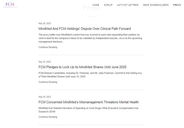 Shareholders are being asked at this time to execute a proxy in favour of FCM's nominees for election to the Board at the AGM or any other resolutions at the AGM, which has been formally scheduled for June 15, 2023. In connection with the AGM, FCM has filed definitive proxy materials with the Securities and Exchange Commission (the "Final FCM Circular") containing further disclosure concerning FCM's nominees for election to the Board at the AGM, together with additional details concerning the completion and return of forms of proxy and voting information forms ("VIFs") for use at the AGM. Shareholders of MindMed are urged to read the Materials filed today as well as the Final FCM Circular, when issued, because they will contain important information.