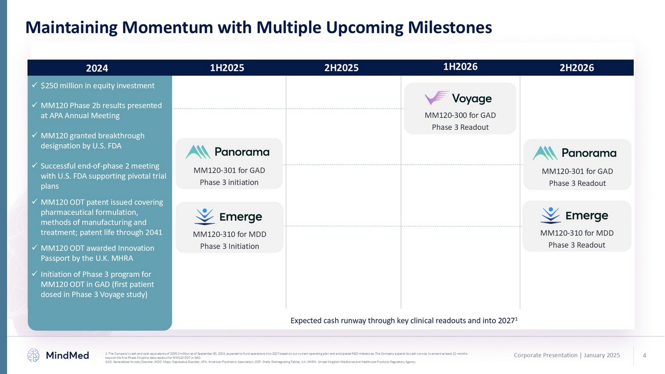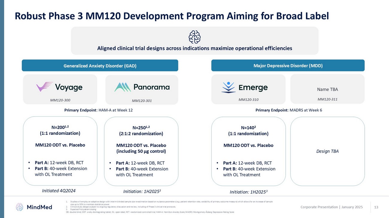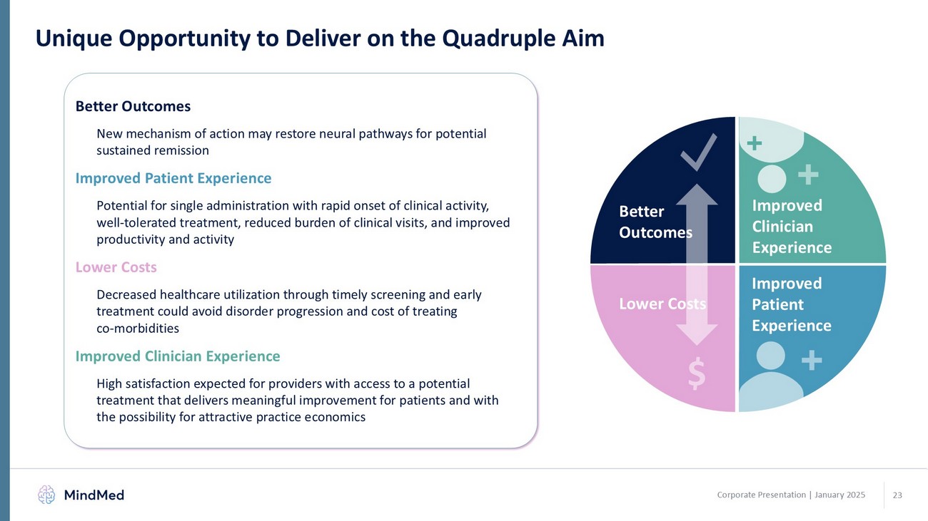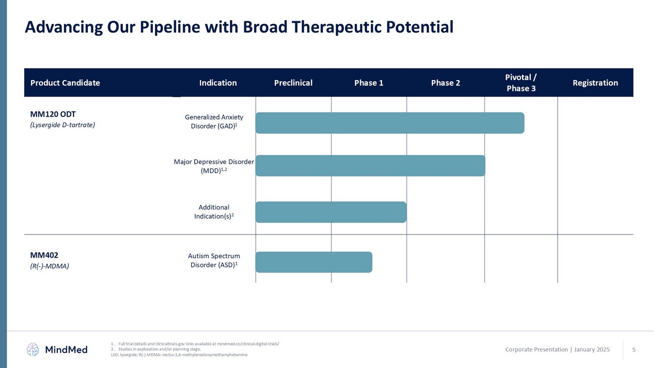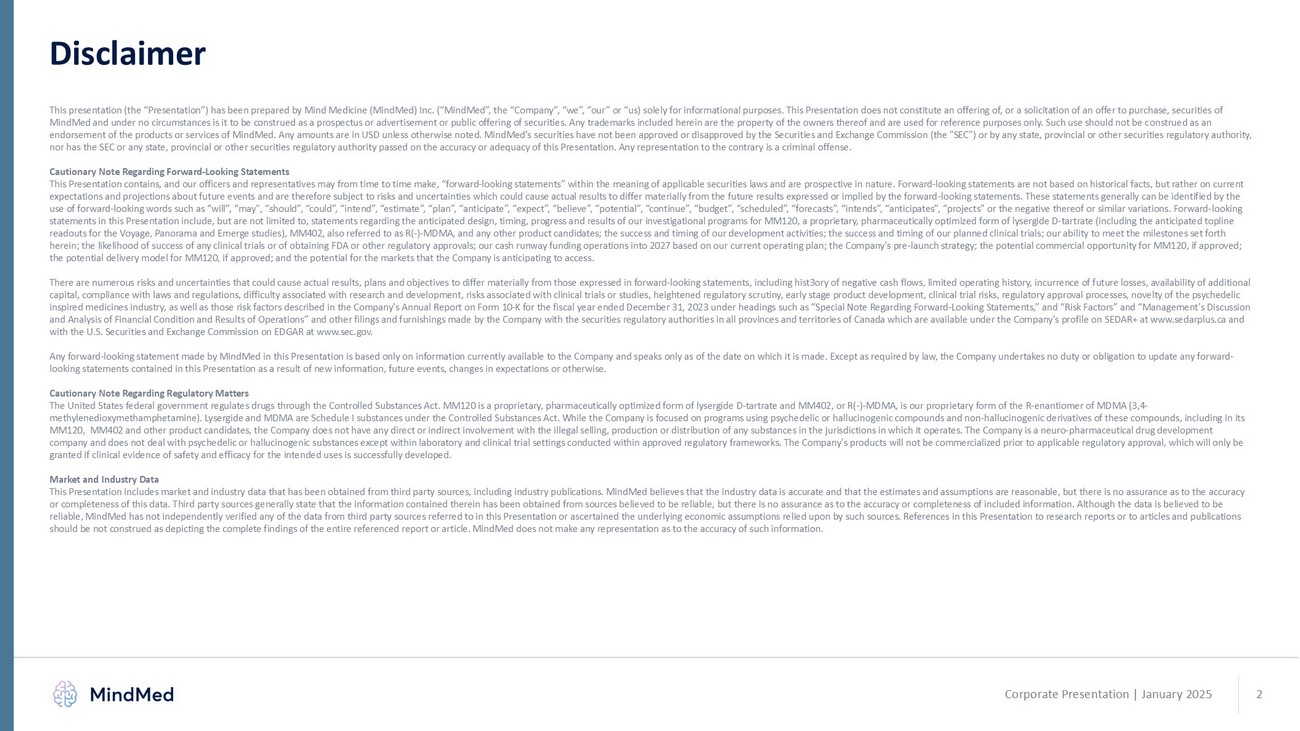 Corporate Presentation | January 2025 This presentation (the “Presentation”) has been prepared by Mind Medicine ( MindMed ) Inc. (“ MindMed ”, the “Company”, “we”, “our” or “us) solely for informational purposes. This Presentation does not constitute an offering of , o r a solicitation of an offer to purchase, securities of MindMed and under no circumstances is it to be construed as a prospectus or advertisement or public offering of securities. Any trade ma rks included herein are the property of the owners thereof and are used for reference purposes only. Such use should not be c ons trued as an endorsement of the products or services of MindMed . Any amounts are in USD unless otherwise noted. MindMed’s securities have not been approved or disapproved by the Securities and Exchange Commission (the "SEC") or by any state, provi nc ial or other securities regulatory authority, nor has the SEC or any state, provincial or other securities regulatory authority passed on the accuracy or adequacy of this Pre sentation. Any representation to the contrary is a criminal offense. Cautionary Note Regarding Forward - Looking Statements This Presentation contains, and our officers and representatives may from time to time make, “forward - looking statements” within the meaning of applicable securities laws and are prospective in nature. Forward - looking statements are not based on historical facts, but rather on current expectations and projections about future events and are therefore subject to risks and uncertainties which could cause actua l r esults to differ materially from the future results expressed or implied by the forward - looking statements. These statements gen erally can be identified by the use of forward - looking words such as “will”, “may", “should”, “could”, “intend”, “estimate”, “plan”, “anticipate”, “expect”, “be lieve”, “potential”, “continue”, “budget”, “scheduled”, “forecasts”, “intends”, “anticipates”, “projects” or the negative the reo f or similar variations. Forward - looking statements in this Presentation include, but are not limited to, statements regarding the anticipated design, timing, progres s a nd results of our investigational programs for MM120, a proprietary, pharmaceutically optimized form of lysergide D - tartrate (including the anticipated topline readouts for the Voyage, Panorama and Emerge studies), MM402, also referred to as R( - ) - MDMA, and any other product candidates; t he success and timing of our development activities; the success and timing of our planned clinical trials; our ability to me et the milestones set forth herein; the likelihood of success of any clinical trials or of obtaining FDA or other regulatory approvals; our cash runway f und ing operations into 2027 based on our current operating plan; the Company's pre - launch strategy; the potential commercial opport unity for MM120, if approved; the potential delivery model for MM120, if approved; and the potential for the markets that the Company is anticipating to acces s. There are numerous risks and uncertainties that could cause actual results, plans and objectives to differ materially from th ose expressed in forward - looking statements, including hist3ory of negative cash flows, limited operating history, incurrence of fu ture losses, availability of additional capital, compliance with laws and regulations, difficulty associated with research and development, risks associated with cli nic al trials or studies, heightened regulatory scrutiny, early stage product development, clinical trial risks, regulatory appro val processes, novelty of the psychedelic inspired medicines industry, as well as those risk factors described in the Company's Annual Report on Form 10 - K for the fiscal year ended December 31, 2023 under headings such as “Special Note Regarding Forward - Looking Statements,” and “Risk Factors” and “Management's Discussion and Analysis of Financial Condition and Results of Operations” and other filings and furnishings made by the Company with the se curities regulatory authorities in all provinces and territories of Canada which are available under the Company's profile on SE DAR+ at www.sedarplus.ca and with the U.S. Securities and Exchange Commission on EDGAR at www.sec.gov. Any forward - looking statement made by MindMed in this Presentation is based only on information currently available to the Company and speaks only as of the date on which it is made. Except as required by law, the Company undertakes no duty or obligation to update any forward - looking statements contained in this Presentation as a result of new information, future events, changes in expectations or o the rwise. Cautionary Note Regarding Regulatory Matters The United States federal government regulates drugs through the Controlled Substances Act. MM120 is a proprietary, pharmaceu tic ally optimized form of lysergide D - tartrate and MM402, or R( - ) - MDMA, is our proprietary form of the R - enantiomer of MDMA (3,4 - methylenedioxymethamphetamine). Lysergide and MDMA are Schedule I substances under the Controlled Substances Act. While the Company is focused on programs using psyche de lic or hallucinogenic compounds and non - hallucinogenic derivatives of these compounds, including in its MM120, MM402 and other product candidates, the Company does not have any direct or indirect involvement with the illegal sel lin g, production or distribution of any substances in the jurisdictions in which it operates. The Company is a neuro - pharmaceutical drug development company and does not deal with psychedelic or hallucinogenic substances except within laboratory and clinical trial settings con ducted within approved regulatory frameworks. The Company's products will not be commercialized prior to applicable regulator y a pproval, which will only be granted if clinical evidence of safety and e