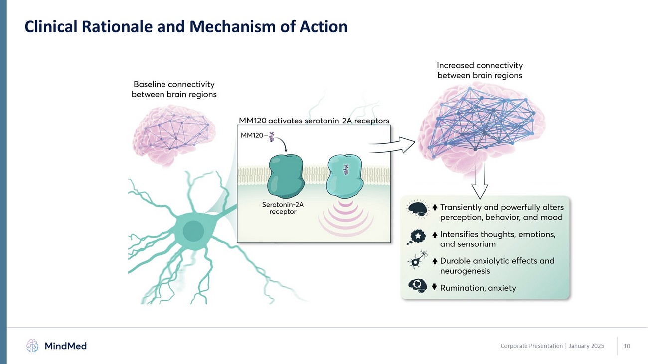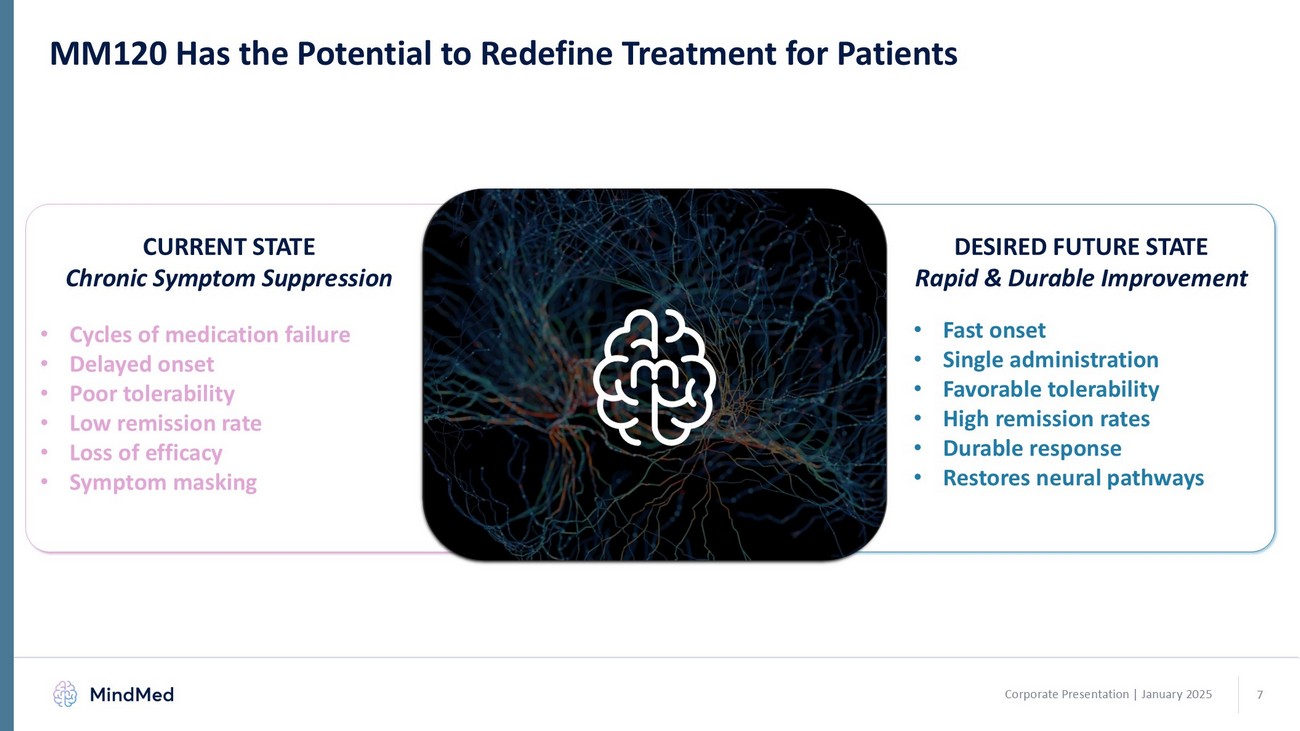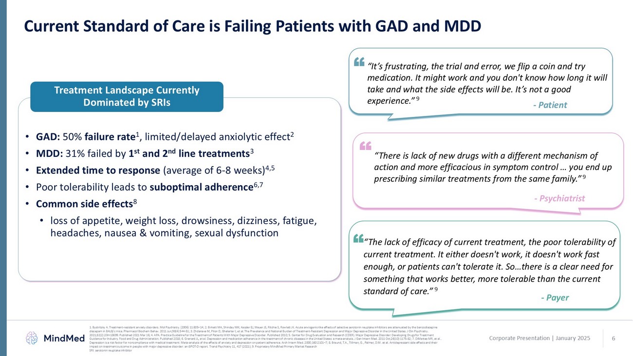 Corporate Presentation | January 2025 Current Standard of Care is Failing Patients with GAD and MDD 1. Bystritsky A. Treatment - resistant anxiety disorders. Mol Psychiatry. (2006) 11:805 – 14; 2. Birkett MA, Shinday NM, Kessler EJ, Meyer JS, Ritchie S, Rowlett JK. Acute anxiogenic - like effects of selective serotonin reuptake inhibitors are attenuated by the benzodiazepine diazepam in BALB/c mice. Pharmacol Biochem Behav. 2011 Jun;98(4):544 - 51; 3. Zhdanava M, Pilon D, Ghelerter I, et al. The Prevale nce and National Burden of Treatment - Resistant Depression and Major Depressive Disorder in the United States. J Clin Psychiatry. 2021;82(2):20m13699. Published 2021 Mar 16; 4. APA. Practice Guideline for the Treatment of Patients With Major Depressive Di sor der. Published 2010; 5. Center for Drug Evaluation and Research (CDER). Major Depressive Disorder: Developing Drugs for Treat men t Guidance for Industry. Food and Drug Administration. Published 2018; 6. Grenard JL, et al. Depression and medication adherenc e i n the treatment of chronic diseases in the United States: a meta - analysis. J Gen Intern Med. 2011 Oct;26(10):1175 - 82; 7. DiMatte o MR, et al.. Depression is a risk factor for noncompliance with medical treatment: Meta - analysis of the effects of anxiety and depression on patient adherence. Arch Intern Med. 2000;160:2101 – 7; 8. Braund, T.A., Tillman, G., Palmer, D.M. et al. Antidepressant side effec ts and their impact on treatment outcome in people with major depressive disorder: an iSPOT - D report. Transl Psychiatry 11, 417 (2021); 9. Pr oprietary MindMed Primary Market Research SRI: serotonin reuptake inhibitor 6 - Payer “The lack of efficacy of current treatment, the poor tolerability of current treatment. It either doesn't work, it doesn't work fast enough, or patients can't tolerate it. So…there is a clear need for something that works better, more tolerable than the current standard of care.” 9 “It’s frustrating, the trial and error, we flip a coin and try medication. It might work and you don't know how long it will take and what the side effects will be. It’s not a good experience.” 9 - Patient “There is lack of new drugs with a different mechanism of action and more efficacious in symptom control … you end up prescribing similar treatments from the same family.” 9 - Psychiatrist Treatment Landscape Currently Dominated by SRIs • GAD: 50% failure rate 1 , limited/delayed anxiolytic effect 2 • MDD: 31% failed by 1 st and 2 nd line treatments 3 • Extended time to response (average of 6 - 8 weeks) 4,5 • Poor tolerability leads to suboptimal adherence 6,7 • Common side effects 8 • loss of appetite, weight loss, drowsiness, dizziness, fatigue, headaches, nausea & vomiting, sexual dysfunction