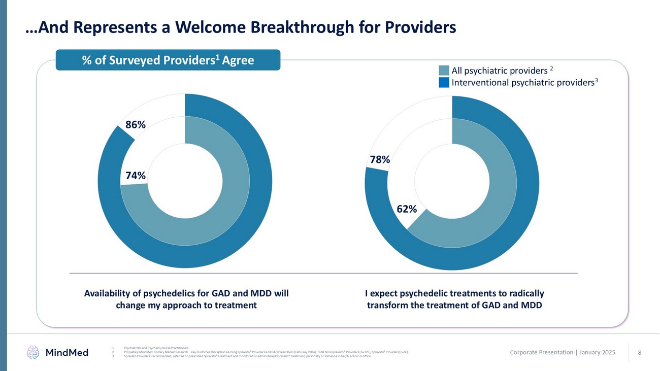 Corporate Presentation | January 2025 …And Represents a Welcome Breakthrough for Providers 1. Psychiatrists and Psychiatry Nurse Practitioners 2. Propietary MindMed Primary Market Research – Key Customer Perceptions Among Spravato® Providers and GAD Prescribers (February 20 24). Total Non - Spravato® Providers (n=125), Spravato® Providers (n=50). 3. Spravato Providers: recommended, referred or prescribed Spravato® treatment and monitored or administered Spravato® treatment, p ersonally or someone in her/his clinic or office. 8 % of Surveyed Providers 1 Agree All psychiatric providers 2 Interventional psychiatric providers 3 Availability of psychedelics for GAD and MDD will change my approach to treatment I expect psychedelic treatments to radically transform the treatment of GAD and MDD 62% 78% 74% 86%