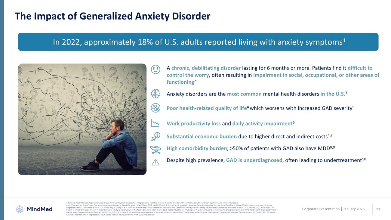 Corporate Presentation | January 2025 The Impact of Generalized Anxiety Disorder 1. National Health Statistics Report. 2024; 213:1 - 12; 2. American Psychiatric Association. Diagnostic and Statistical Manual of Mental Disorders. 5th ed. Washington, DC: American Psychiatric Association; 2013:222; 3. https://www.nimh.nih.gov/health/statistics/any - anxiety - disorder; 4. Revicki DA, et al. J Affect Disord. 2012;140(2):103 - 112. 5. Duong P, et al. Association Between Generalized Anxiety Disorder Scale (GAD - 7) and 5 - Level EQ - 5D Index Scores Among US Adults Diagnosed with GAD. Presented at ECNP 2024. Milan, Italy; 6. Duong P, et al. Work Productivity and Activity Impairment Associ ate d with Generalized Anxiety Disorder among Adults in the United States. Presented at ISPOR. 2024. Atlanta, GA; 7. Kavelaars R. Th e burden of anxiety among a nationally representative U.S. adult population, Journal of Affective Disorders. 2023; 336: 81 - 91; 8. Kessler RC, Sampson NA, Berglund P, et al: Anxious and non - anxious major depressive disorder in the World Health Organization Wo rld Mental Health Surveys. Epidemiol Psychiatr Sci 2015; 24:210 – 226; 9. Carter R. M., et al. One - year prevalence of subthreshold and threshold DSM - IV generalized anxiety disorder in a nationally representative sample. Depress Anxiety. 13, 78 – 88 (2001); 10. Kas per S. Anxiety disorders: under - diagnosed and insufficiently treated. Int J PsychiatryClin Pract. 2006;10(supp1):3 - 9 11 A chronic, debilitating disorder lasting for 6 months or more. Patients find it difficult to control the worry , often resulting in impairment in social, occupational, or other areas of functioning 2 Anxiety disorders are the most common mental health disorders in the U.S. 3 Poor health - related quality of life 4 which worsens with increased GAD severity 5 Work productivity loss and daily activity impairment 6 Substantial economic burden due to higher direct and indirect costs 4,7 High comorbidity burden ; >50% of patients with GAD also have MDD 8,9 Despite high prevalence, GAD is underdiagnosed , often leading to undertreatment 10 In 2022, approximately 18% of U.S. adults reported living with anxiety symptoms 1