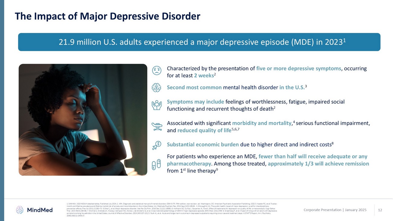 Corporate Presentation | January 2025 The Impact of Major Depressive Disorder 1. SAMHSA. 2023 NSDUH detailed tables. Published July 2024; 2. APA. Diagnostic and statistical manual of mental disorders: DSM - 5 - TR. Fifth edition, text revision. ed. Washington, DC: American Psychiatric Association Publishing; 2022 3. Kessler RC, et al. T welve - month and lifetime prevalence and lifetime morbid risk of anxiety and mood disorders in the United States. Int J Methods Psyc hia tr Res. 2012 Sep;21(3):169 - 84. 4. McLaughlin KA. The public health impact of major depression: a call for interdisciplinary prevention efforts. Prev Sci 2011;12:361 – 71 5.Otte C,, et al. Major depressive disorder. Nat Rev Dis Prim. 2016 Dec 22;2(1):160 65; 6. Hofmann SG, Curtiss J, Carpenter JK, Kind S. Effect of treatments for depression on quality of life: a meta - analysis. Cog n Behav Ther. 2017;46(4):265 – 86; 7. Bromet E, Andrade LH, Hwang I, Sampson NA, Alonso J, de Girolamo G, et al. Cross - national epidemiolo gy of DSM - IV major depressive episode. BMC Med. 2011;9:90 8. Greenberg P, et al. Impact of living with an adult with depressive symptoms among households in the United States. Journal of Affective Disorders. 2024;349:107 - 115; 9. Rush AJ, et al. Acute and l onger - term outcomes in depressed outpatients requiring one or several treatment steps: A STAR*D Report. Am J Psychiatry. 2006;163(11):1905 - 17. 12 Characterized by the presentation of five or more depressive symptoms , occurring for at least 2 weeks 2 Second most common mental health disorder in the U.S. 3 Symptoms may include feelings of worthlessness, fatigue, impaired social functioning and recurrent thoughts of death 2 Associated with significant morbidity and mortality , 4 serious functional impairment, and reduced quality of life 5,6,7 Substantial economic burden due to higher direct and indirect costs 8 For patients who experience an MDE, fewer than half will receive adequate or any pharmacotherapy . Among those treated, approximately 1/3 will achieve remission from 1 st line therapy 9 21.9 million U.S. adults experienced a major depressive episode (MDE) in 2023 1