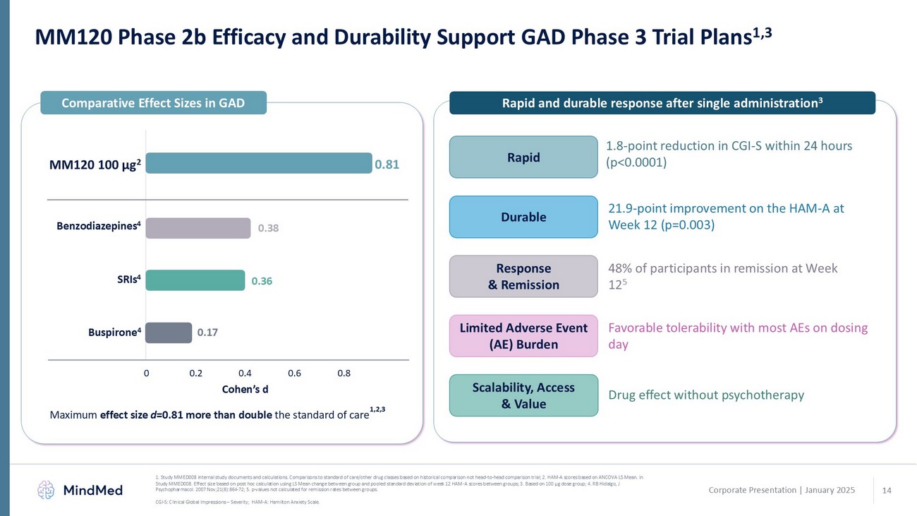 Corporate Presentation | January 2025 1. Studies will employ an adaptive design with interim blinded sample size re - estimation based on nuisance parameters (e.g. patient retention rate, variability of primary outcome measure) which allows for an increase of sample size up to 50% to maintain statistical power. 2. Clinical study designs subject to ongoing regulatory discussion and review, including of Phase 3 clinical trial protocols. 3. Expected first patient dosing DB: double blind; ODT: orally disintegrating tablet; OL: open - label; RCT: randomized controlled trial; HAM - A: Hamilton Anxiety S cale; MADRS: Montgomery - Åsberg Depression Rating Scale 13 MM120 - 300 MM120 - 301 Aligned clinical trial designs across indications maximize operational efficiencies Generalized Anxiety Disorder (GAD) Major Depressive Disorder (MDD) MM120 - 310 N=200 1,2 (1 :1 randomization) MM120 ODT vs. Placebo • Part A: 12 - week DB, RCT • Part B: 40 - week Extension with OL Treatment N=250 1,2 ( 2 :1:2 randomization) MM120 ODT vs. Placebo (including 50 µg control) • Part A: 12 - week DB, RCT • Part B: 40 - week Extension with OL Treatment N=140 2 (1:1 randomization) MM120 ODT vs. Placebo • Part A: 12 - week DB, RCT • Part B: 40 - week Extension with OL Treatment Initiated 4Q2024 Initiation: 1H2025 3 Initiation: 1H2025 3 Name TBA MM120 - 311 Design TBA Primary Endpoint : HAM - A at Week 12 Primary Endpoint : MADRS at Week 6 Robust Phase 3 MM120 Development Program Aiming for Broad Label