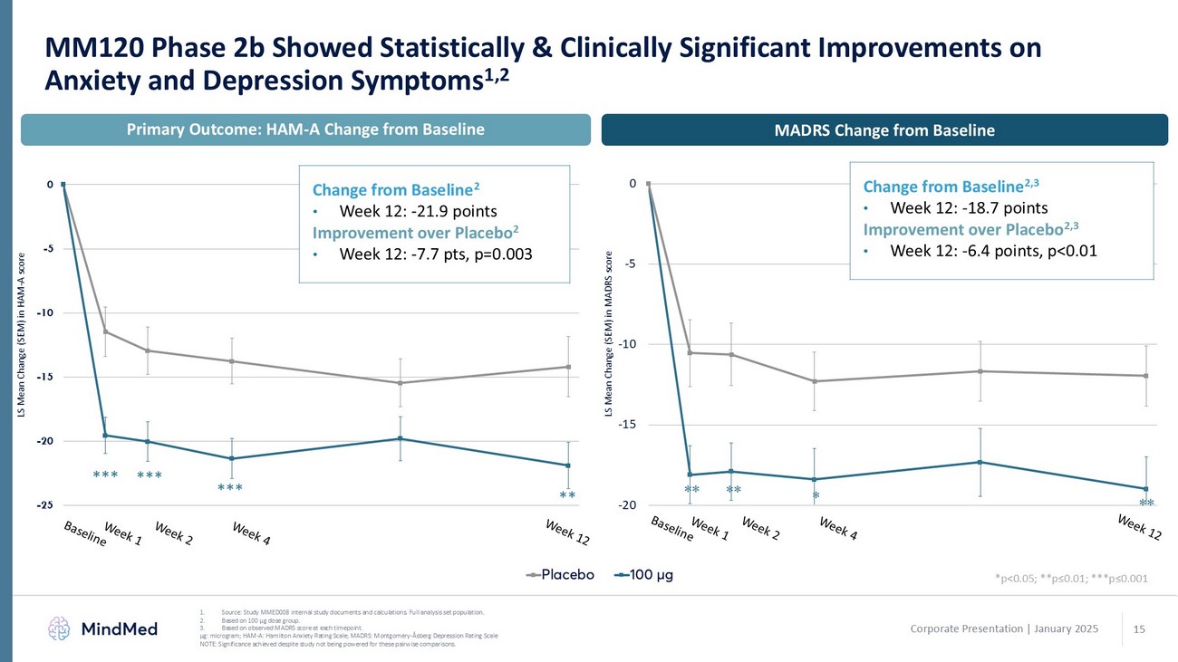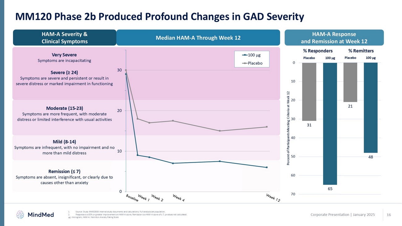Corporate Presentation | January 2025 MM120 Phase 2b Produced Profound Changes in GAD Severity 1. Source: Study MMED008 internal study documents and calculations. Full analysis set population. 2. Response is a 50% or greater improvement on HAM - A score; Remission is a HAM - A score of ≤ 7; p - values not calculated. μ g: microgram; HAM - A: Hamilton Anxiety Rating Scale 16 21 48 Placebo 100 µg % Remitters 31 65 0 10 20 30 40 50 60 70 Placebo 100 µg Percent of Participants Meeting Criteria at Week 12 % Responders HAM - A Response and Remission at Week 12 Median HAM - A Through Week 12 HAM - A Severity & Clinical Symptoms Very Severe Symptoms are incapacitating Severe (≥ 24) Symptoms are severe and persistent or result in severe distress or marked impairment in functioning Moderate (15 - 23) Symptoms are more frequent, with moderate distress or limited interference with usual activities Mild (8 - 14) Symptoms are infrequent, with no impairment and no more than mild distress Remission (≤ 7) Symptoms are absent, insignificant, or clearly due to causes other than anxiety 0 10 20 30 100 µg Placebo