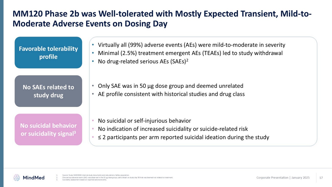 Corporate Presentation | January 2025 MM120 Phase 2b was Well - tolerated with Mostly Expected Transient, Mild - to - Moderate Adverse Events on Dosing Day 1. Source: Study MMED008 internal study documents and calculations. Safety population. 2. One serious adverse event (SAE) was observed in the 50 µg dose group: panic attack on study day 98 that was deemed not relate d t o treatment. 3. Suicidality assessment based on reported adverse events. 17 • Virtually all (99%) adverse events (AEs) were mild - to - moderate in severity • Minimal (2.5%) treatment emergent AEs (TEAEs) led to study withdrawal • No drug - related serious AEs (SAEs) 2 Favorable tolerability profile No SAEs related to study drug No suicidal behavior or suicidality signal 3 • Only SAE was in 50 µg dose group and deemed unrelated • AE profile consistent with historical studies and drug class • No suicidal or self - injurious behavior • No indication of increased suicidality or suicide - related risk • ≤ 2 participants per arm reported suicidal ideation during the study