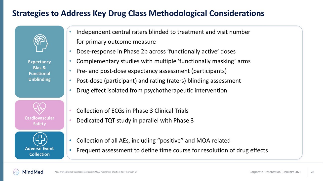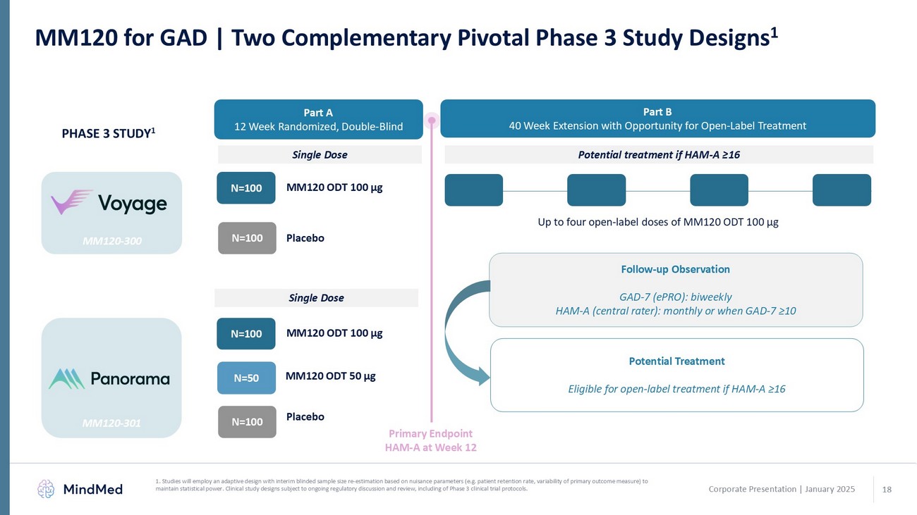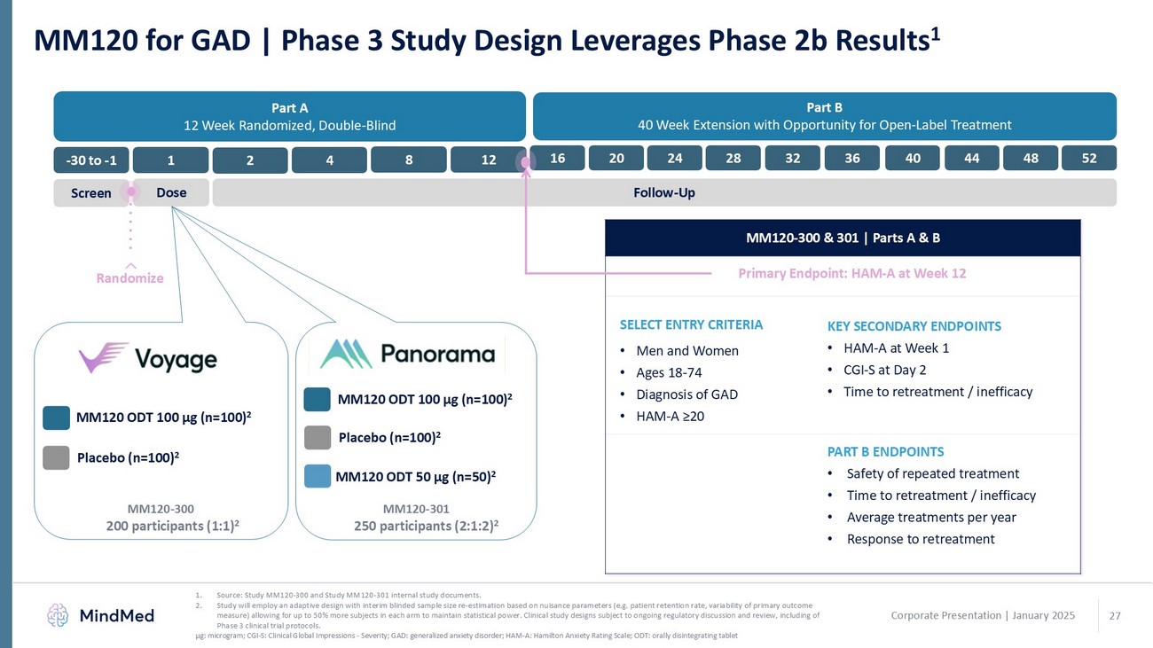 Corporate Presentation | January 2025 27 MM120 - 301 250 participants (2:1:2) 2 Randomize Screen Dose Follow - Up MM120 ODT 1 00 µg (n=100) 2 MM120 ODT 50 µg (n=50) 2 Placebo (n=100) 2 MM120 - 300 200 participants (1:1) 2 MM120 ODT 1 00 µg (n=100) 2 Placebo (n=100) 2 Week - 30 to - 1 1 2 4 8 12 16 20 24 28 32 36 40 44 48 52 MM120 for GAD | Phase 3 Study Design Leverages Phase 2b Results 1 1. Source: Study MM120 - 300 and Study MM120 - 301 internal study documents. 2. Study will employ an adaptive design with interim blinded sample size re - estimation based on nuisance parameters (e.g. patient r etention rate, variability of primary outcome measure) allowing for up to 50% more subjects in each arm to maintain statistical power. Clinical study designs subject to on goi ng regulatory discussion and review, including of Phase 3 clinical trial protocols. μ g: microgram; CGI - S: Clinical Global Impressions - Severity; GAD: generalized anxiety disorder; HAM - A: Hamilton Anxiety Rating S cale; ODT: orally disintegrating tablet MM120 - 300 & 301 | Parts A & B KEY SECONDARY ENDPOINTS • HAM - A at Week 1 • CGI - S at Day 2 • Time to retreatment / inefficacy SELECT ENTRY CRITERIA • Men and Women • Ages 18 - 74 • Diagnosis of GAD • HAM - A ≥20 Part A 12 Week Randomized, Double - Blind Part B 40 Week Extension with Opportunity for Open - Label Treatment Primary Endpoint: HAM - A at Week 12 PART B ENDPOINTS • Safety of repeated treatment • Time to retreatment / inefficacy • Average treatments per year • Response to retreatment