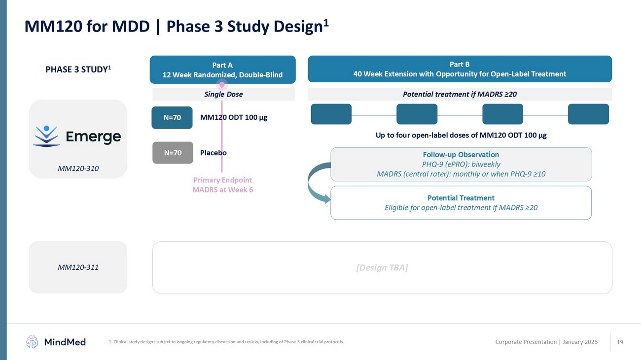 Corporate Presentation | January 2025 MM120 - 301 MM120 - 300 MM120 for GAD | Two Complementary Pivotal Phase 3 Study Designs 1 1. Studies will employ an adaptive design with interim blinded sample size re - estimation based on nuisance parameters (e.g. pati ent retention rate, variability of primary outcome measure) to maintain statistical power. Clinical study designs subject to ongoing regulatory discussion and review, including of Phase 3 cli nical trial protocols. 18 MM120 ODT 1 00 µg N=100 Placebo N=100 Part A 12 Week Randomized, Double - Blind Part B 40 Week Extension with Opportunity for Open - Label Treatment MM120 ODT 1 00 µg N=100 Placebo N=100 MM120 ODT 50 µg N=50 PHASE 3 STUDY 1 Single Dose Potential treatment if HAM - A ≥16 Primary Endpoint HAM - A at Week 12 Up to four open - label doses of MM120 ODT 1 00 µg Single Dose Follow - up Observation GAD - 7 (ePRO): biweekly HAM - A (central rater): monthly or when GAD - 7 ≥10 Potential Treatment Eligible for open - label treatment if HAM - A ≥16