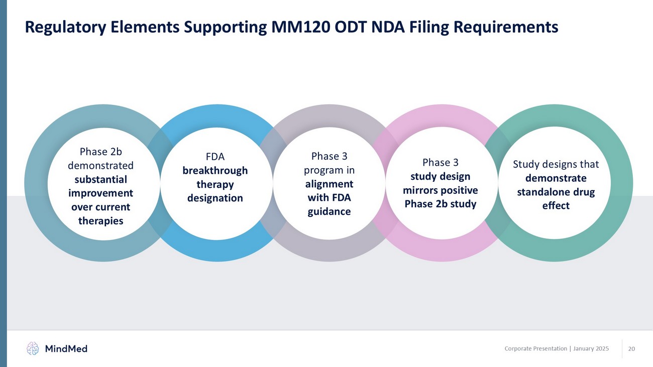 Corporate Presentation | January 2025 Today. Regulatory Elements Supporting MM120 ODT NDA Filing Requirements Study designs that demonstrate standalone drug effect FDA breakthrough therapy designation Phase 2b demonstrated substantial improvement over current therapies Phase 3 program in alignment with FDA guidance Phase 3 study design mirrors positive Phase 2b study 20