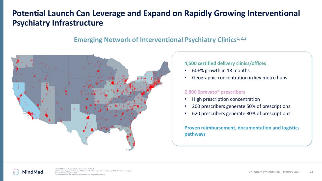 Corporate Presentation | January 2025 Potential Launch Can Leverage and Expand on Rapidly Growing Interventional Psychiatry Infrastructure 1. As of 2Q2024; centers certified under the Spravato REMS 2. J&J Investor Day presentation, July 2024, Johnson & Johnson Spravato® website, July 2024. Compiled by company. IQVIA Rx data analysis; June 2023 3. Clinic and prescriber numbers are approximate and compiled by company. 24 Emerging Network of Interventional Psychiatry Clinics 1,2,3 4,500 certified delivery clinics/offices • 60+% growth in 18 months • Geographic concentration in key metro hubs 2,800 Spravato ® prescribers • High prescription concentration • 200 prescribers generate 50% of prescriptions • 620 prescribers generate 80% of prescriptions Proven reimbursement, documentation and logistics pathways