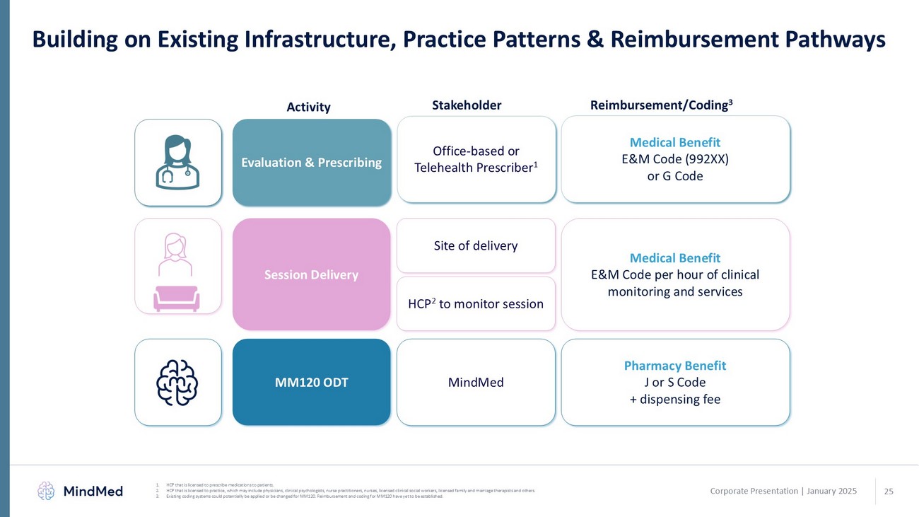 Corporate Presentation | January 2025 Building on Existing Infrastructure, Practice Patterns & Reimbursement Pathways 1. HCP that is licensed to prescribe medications to patients. 2. HCP that is licensed to practice, which may include physicians, clinical psychologists, nurse practitioners, nurses, licensed cl inical social workers, licensed family and marriage therapists and others. 3. Existing coding systems could potentially be applied or be changed for MM120. Reimbursement and coding for MM120 have yet to be established. 25 Office - based or Telehealth Prescriber 1 Evaluation & Prescribing MindMed MM120 ODT Site of delivery Session Delivery Activity Medical Benefit E&M Code (992XX) or G Code Pharmacy Benefit J or S Code + dispensing fee Medical Benefit E&M Code per hour of clinical monitoring and services Stakeholder Reimbursement/Coding 3 HCP 2 to monitor session